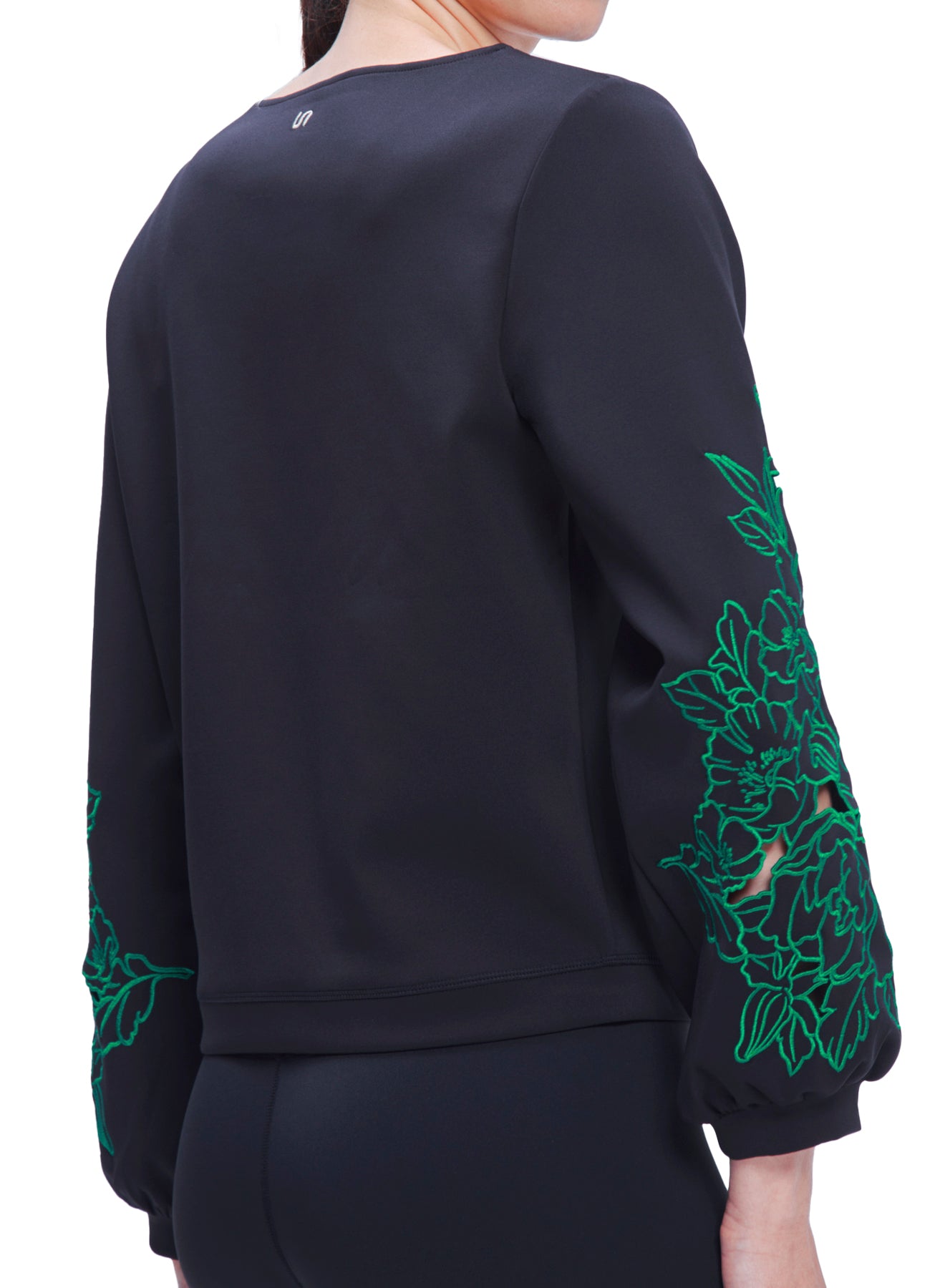 Our new Floral Embroidered Pullover is a chic, semi-relaxed fit top made of silky, no-wrinkle, sweat wicking scuba fabric. The balloon sleeves feature laser cutouts and exquisite embroidery, and the boat neck and loose hem allow this style to work well with leggings, jeans, skirts, pants... you name it, this top will dress it up. Machine washable. This style runs true to size and hits at the hip.