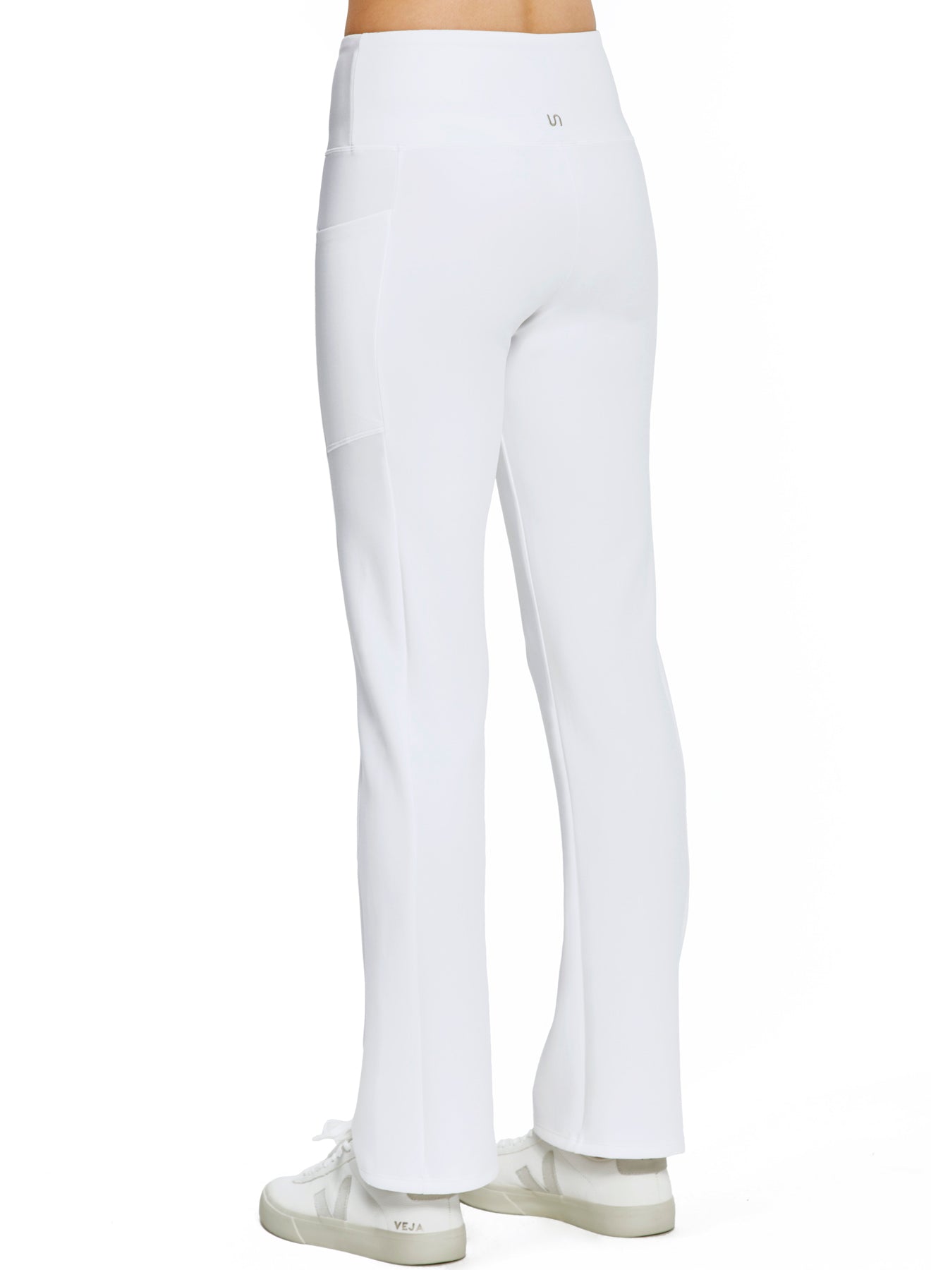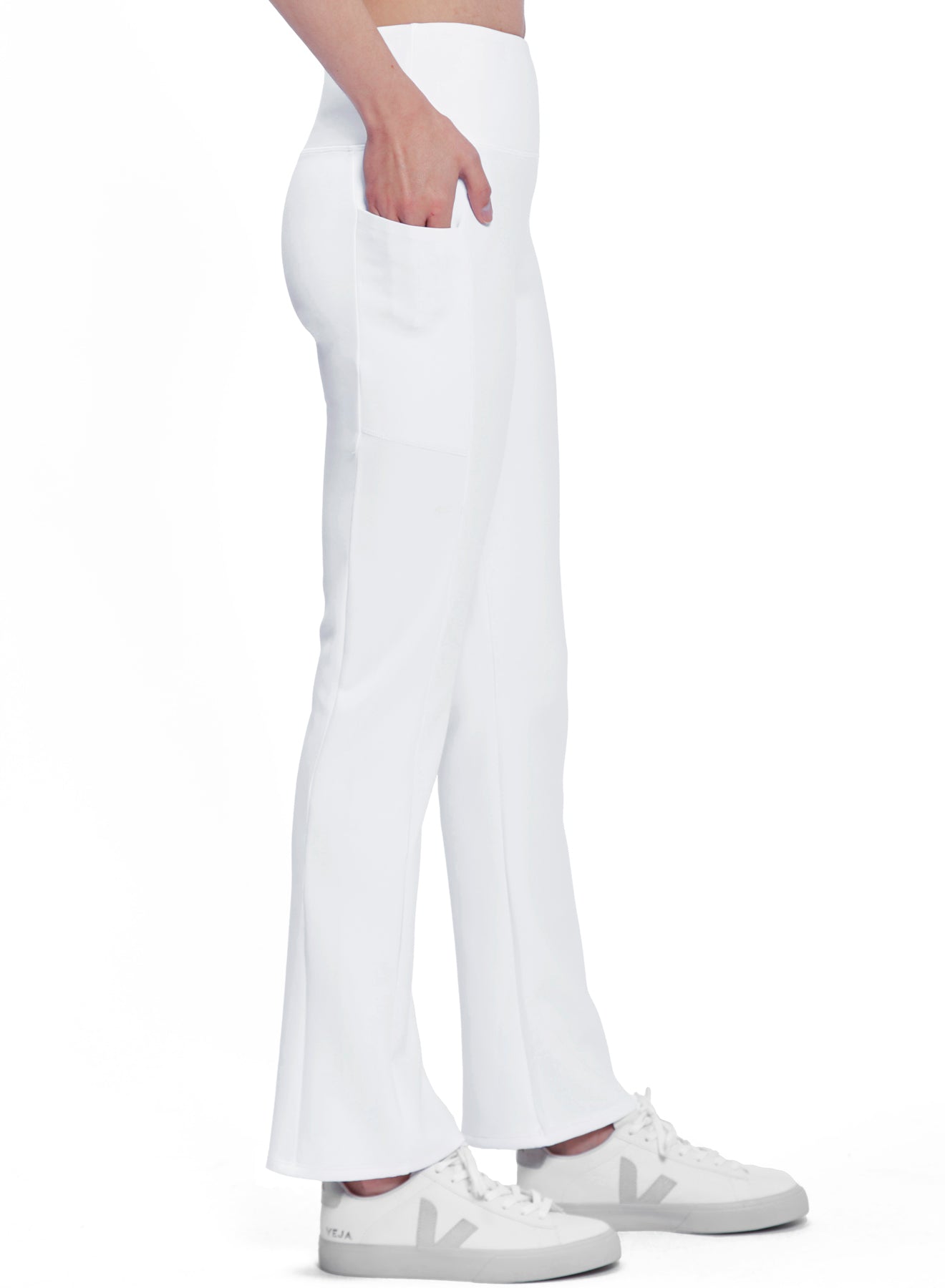 This style lives up to its name. Crafted from a lightweight scuba/neoprene material, this pant moves with you but also holds you in in all the right places. The wide, high waist helps nip the waist in, and the bootcut opening provides a sleek silhouette. They feature a roomy side pocket on each side. Meant to be worn for anything from working out to work, these literally are pants to wear EVERYWHERE. The style is designed to be fitted on top and semi relaxed through the legs and run true to size.