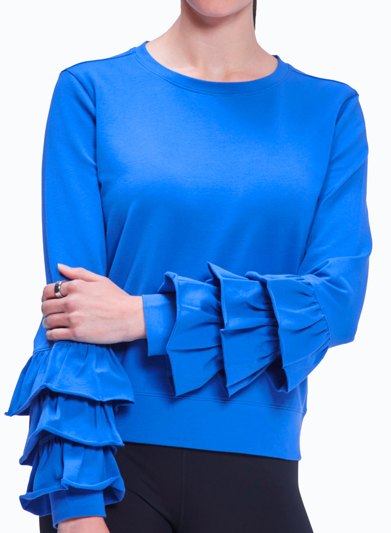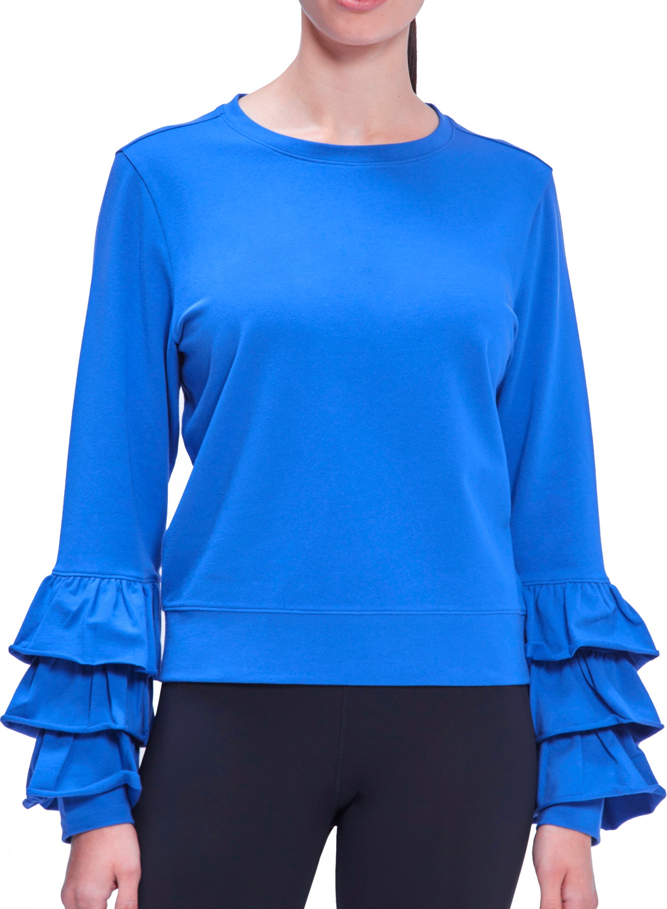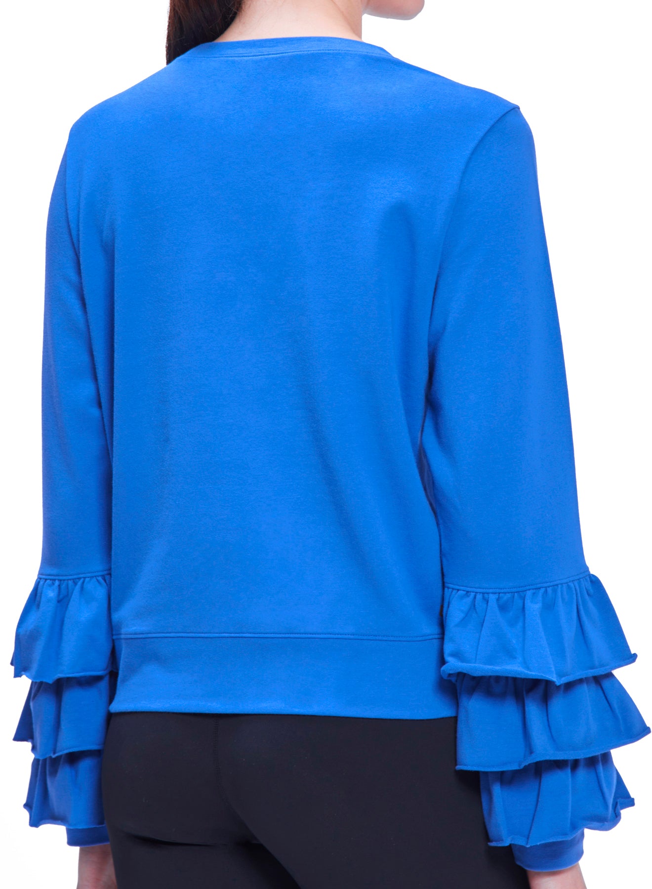 A newcomer to our collection of Ruffle styles is this lightweight French terry sweatshirt with 3 rows of adorable ruffles on each sleeve. It is cut to be slightly boxy and to hit just below the hip (short but not cropped - the model is 5'10"). Wear it as a topper to complete your activewear fit, or simply as an adorable top with jeans, skirts, or whatever else you have in your wardrobe.